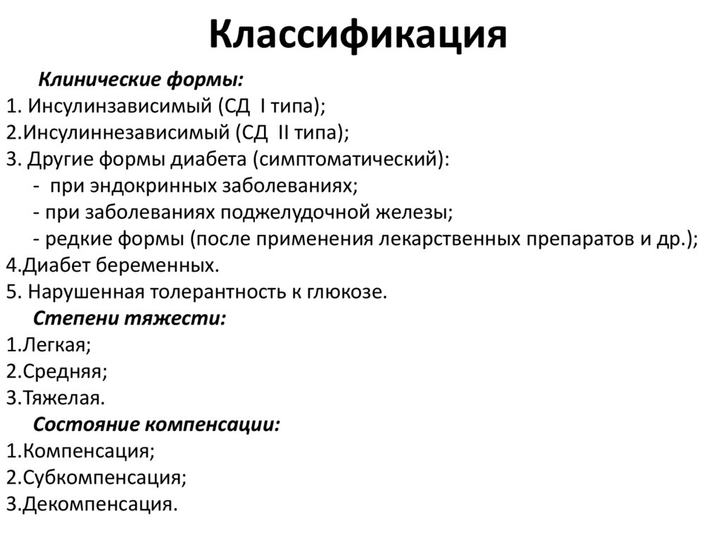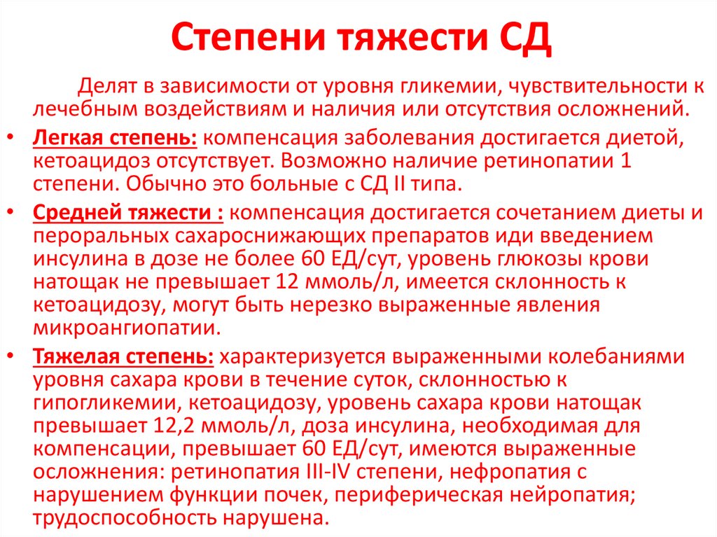 Степени тяжести СДДелят в зависимости от уровня гликемии, чувствительности к