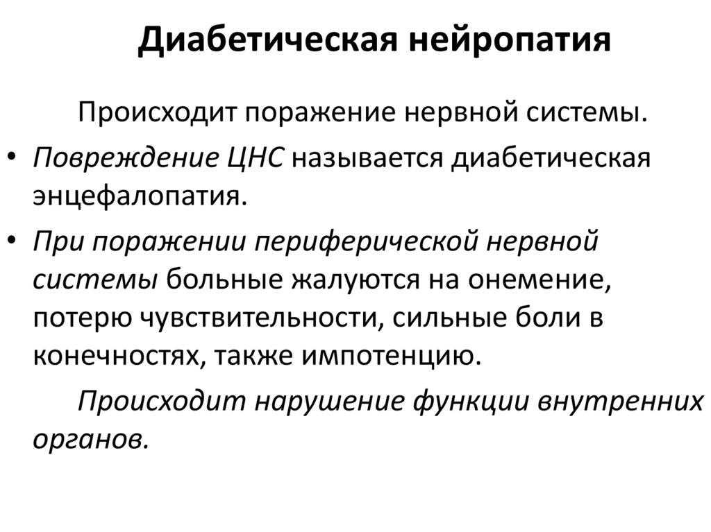 • Повреждение ЦНС называется диабетическая