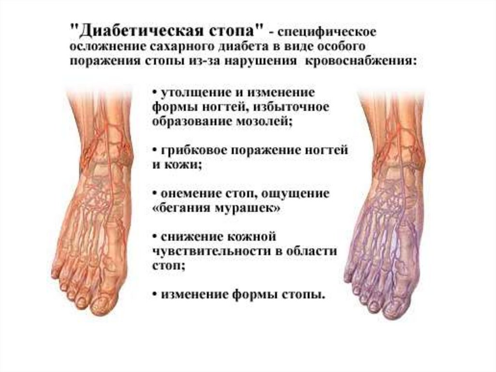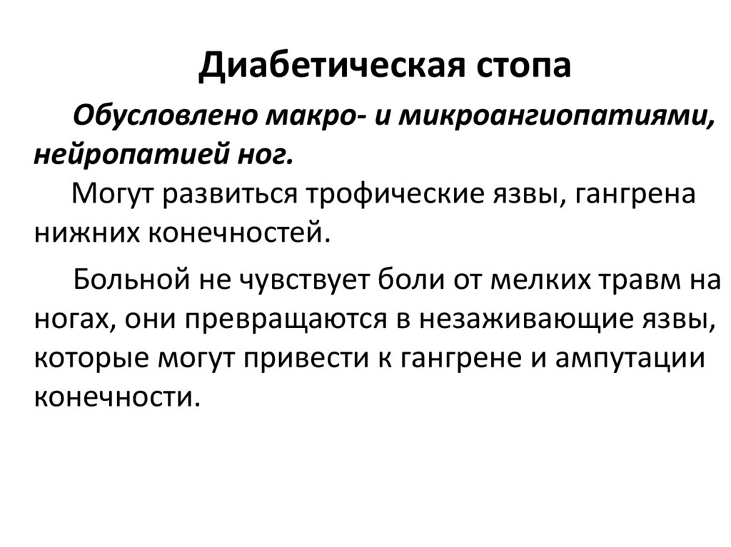 Диабетическая стопаОбусловлено макро- и микроангиопатиями,
