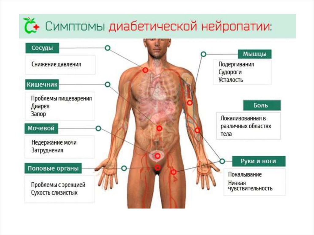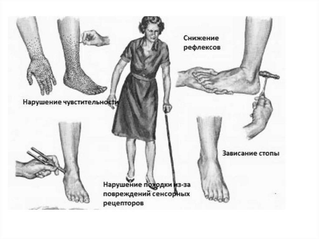 Диабетическая нейропатияПроисходит поражение нервной системы.