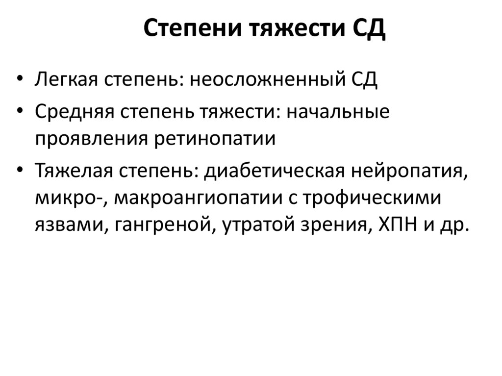 Степени тяжести СД• Легкая степень: неосложненный СД