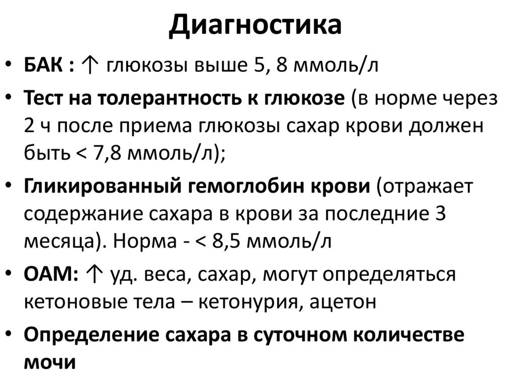Диагностика• БАК : ↑ глюкозы выше 5, 8 ммоль/л