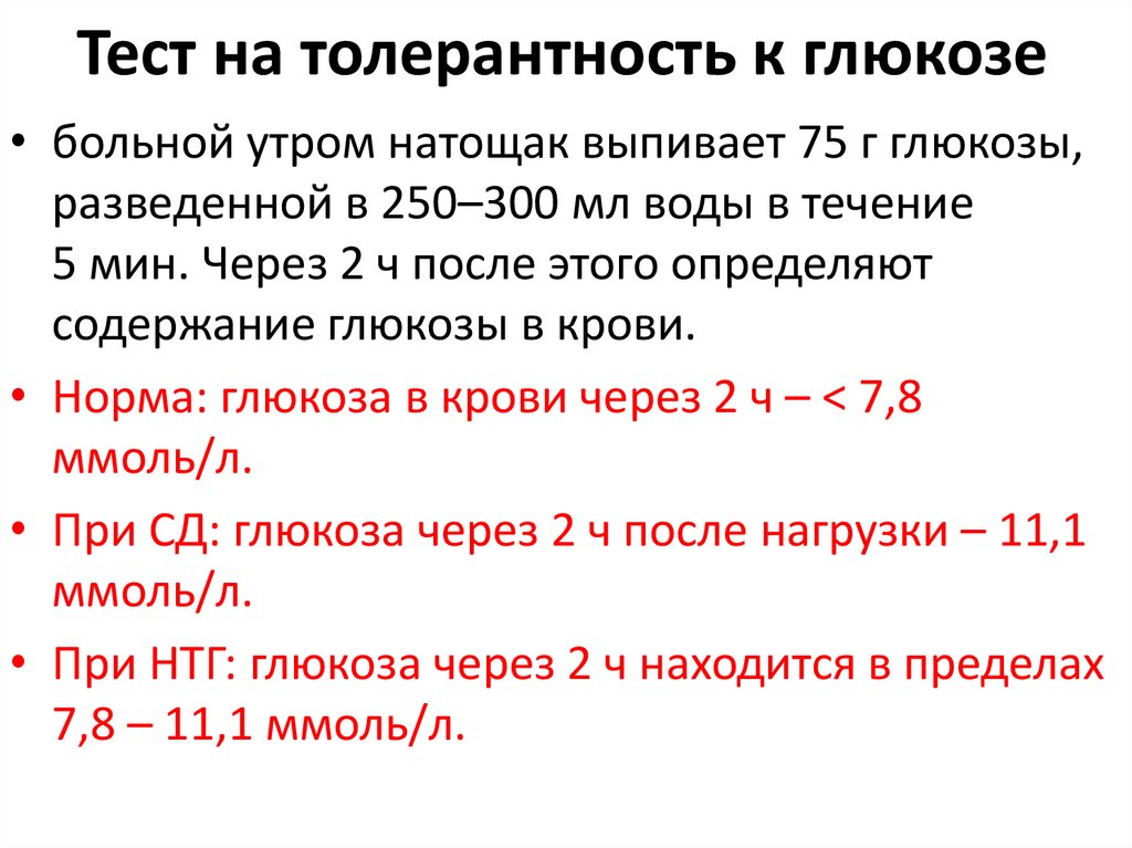 • Тест на толерантность к глюкозе (в норме через
