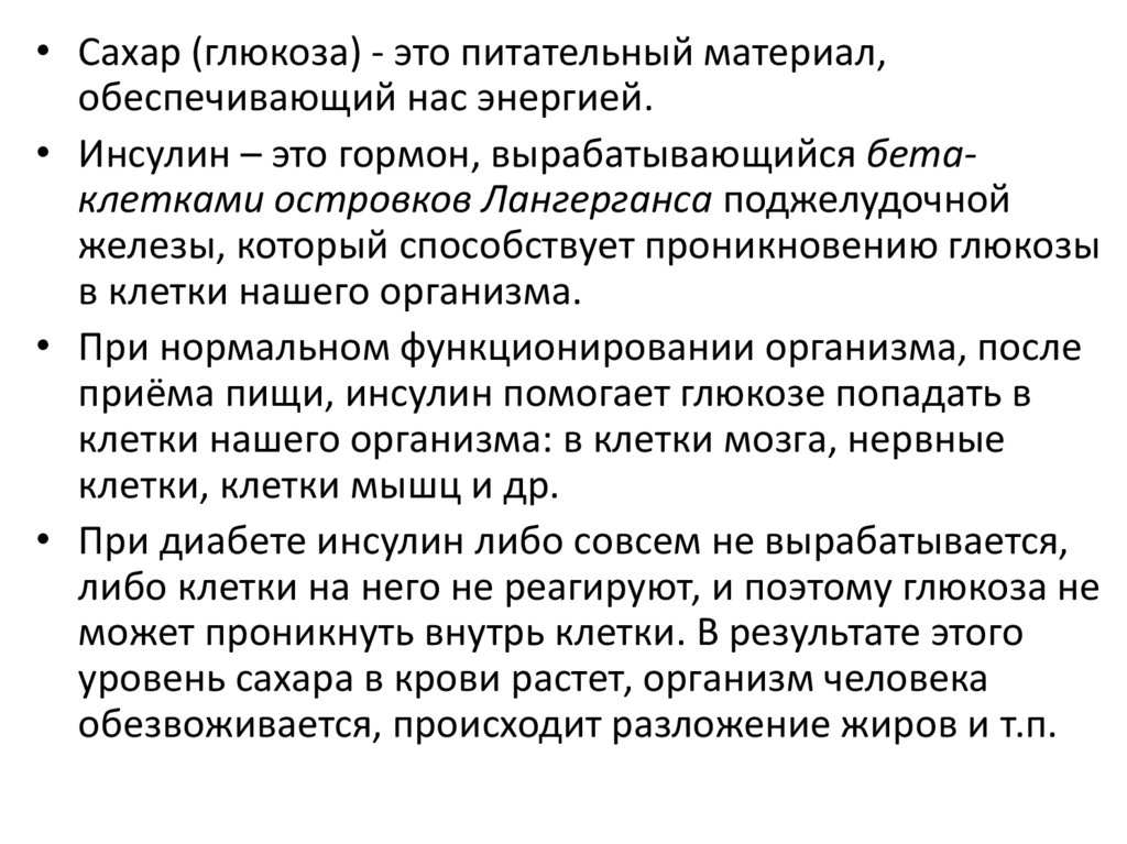 • При диабете инсулин либо совсем не вырабатывается,