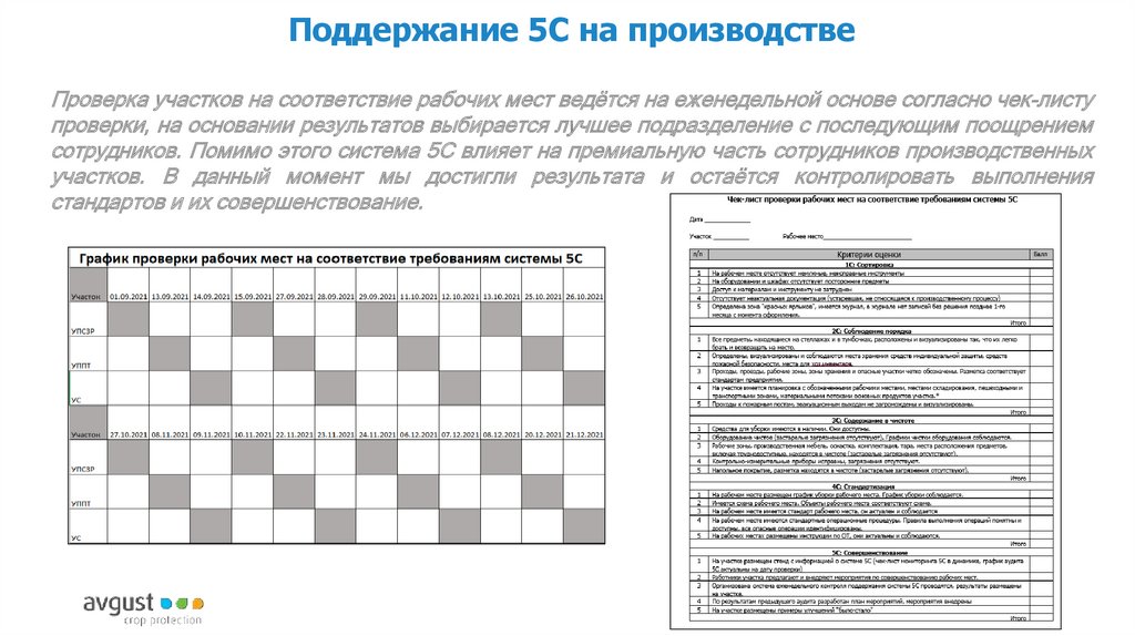 Поддержание 5С на производствеПроверка участков на соответствие рабочих мест ведётся на еженедельной основе согласно чек-листу