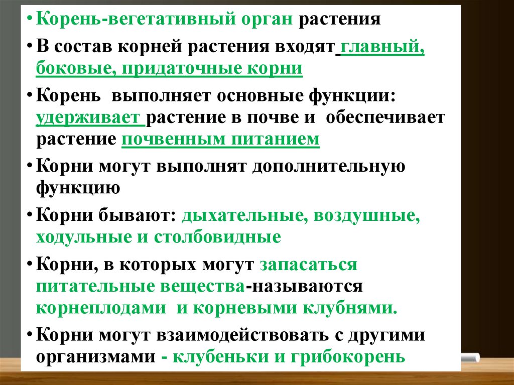 • Корень-вегетативный орган растения• В состав корней растения входят главный,