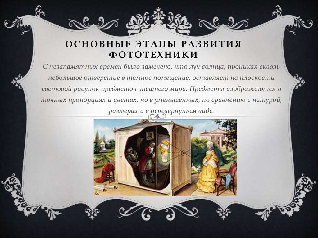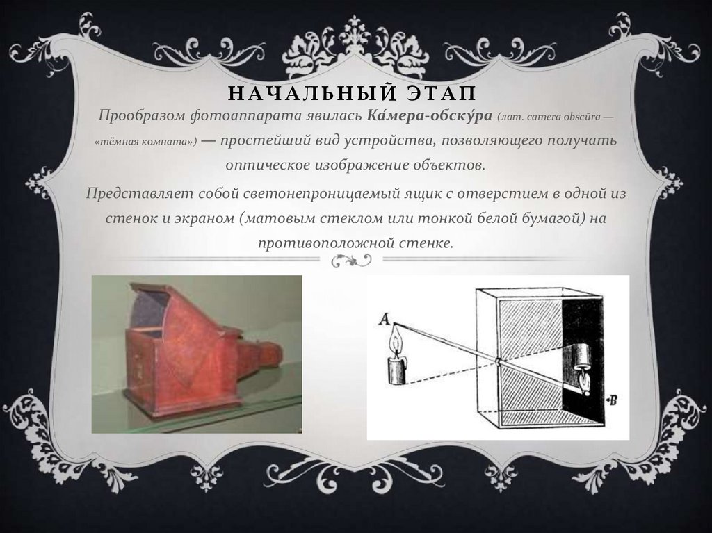 НАЧАЛЬНЫЙ ЭТАППрообразом фотоаппарата явилась Ка́мера-обску́ра (лат. camera obscūra —