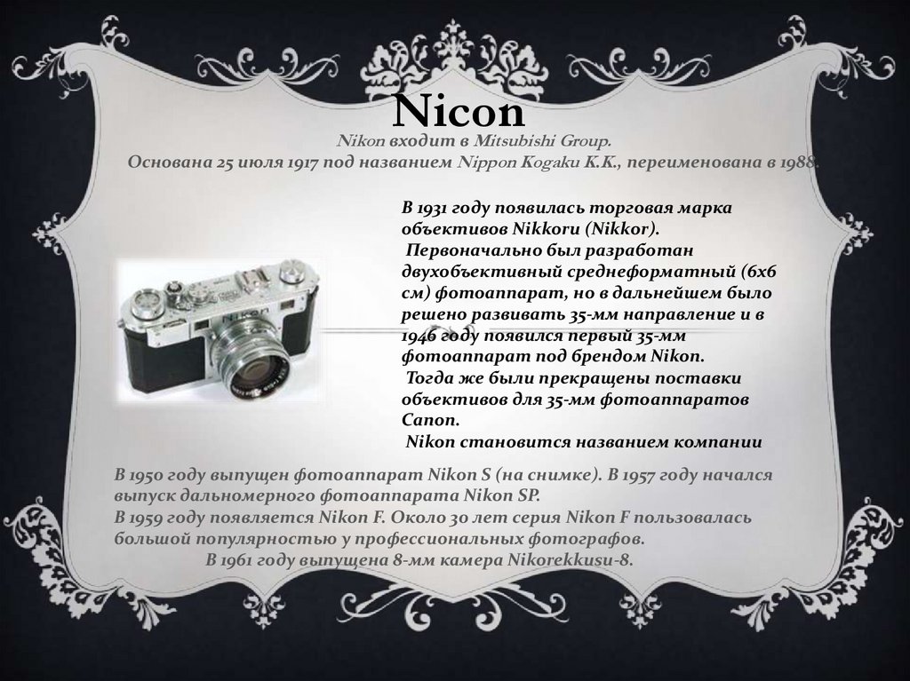 В 1950 году выпущен фотоаппарат Nikon S (на снимке). В 1957 году начался
