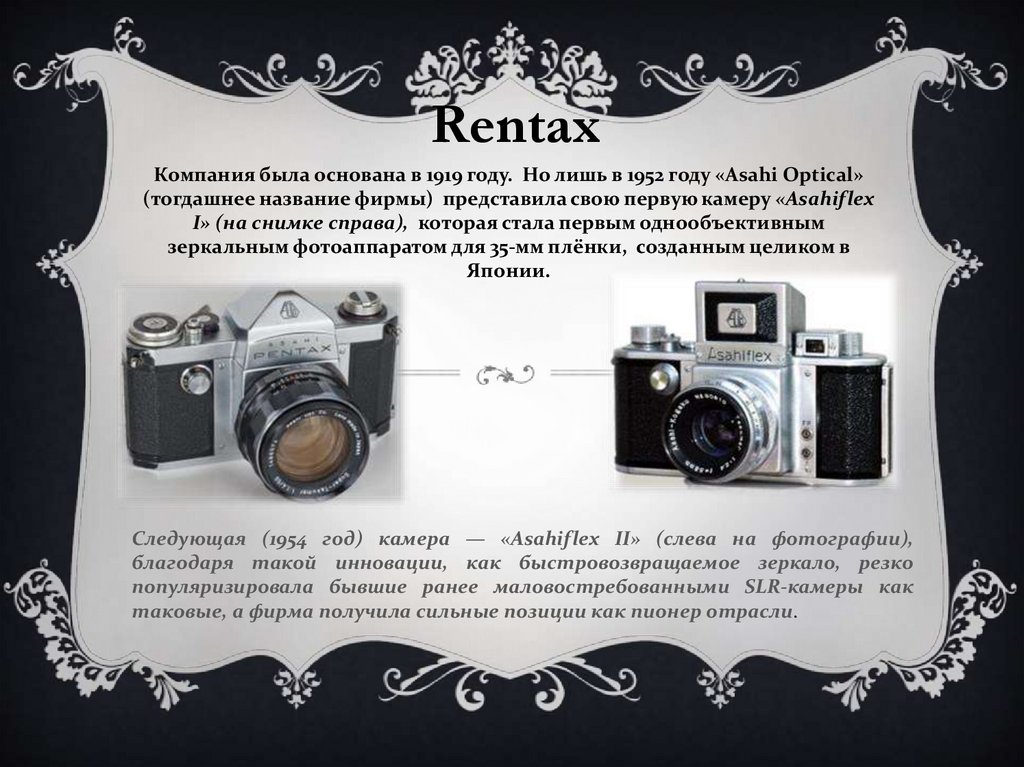 RentaxКомпания была основана в 1919 году. Но лишь в 1952 году «Asahi Optical»