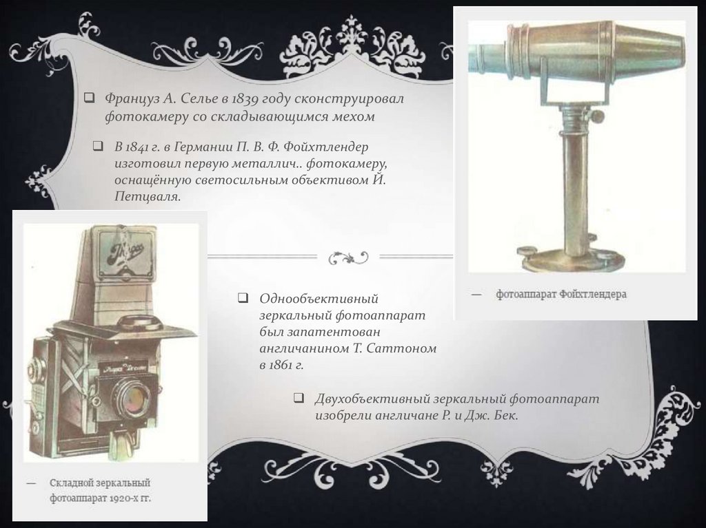 Француз А. Селье в 1839 году сконструировалфотокамеру со складывающимся мехом