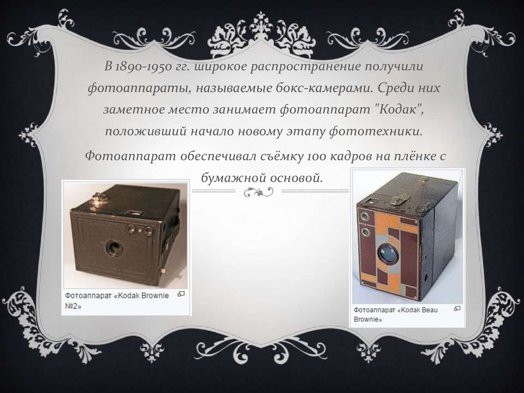 В 1890-1950 гг. широкое распространение получилифотоаппараты, называемые бокс-камерами. Среди них