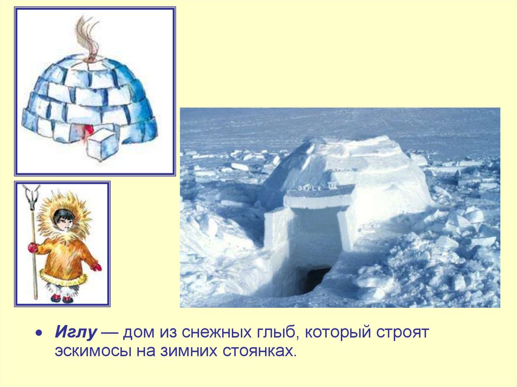 Иглу — дом из снежных глыб, который строятэскимосы на зимних стоянках.