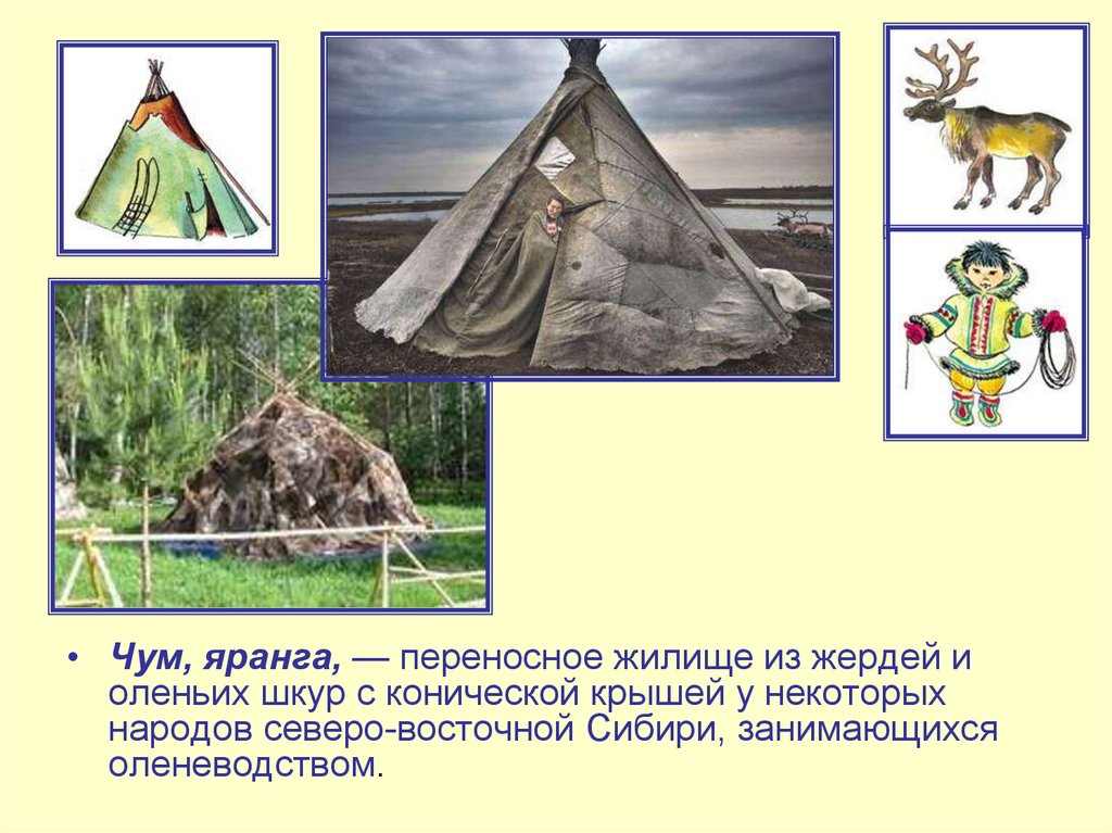 • Чум, яранга, — переносное жилище из жердей иоленьих шкур с конической крышей у некоторых
