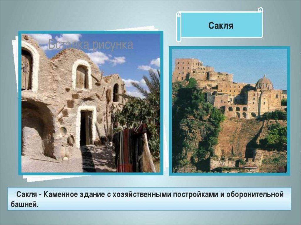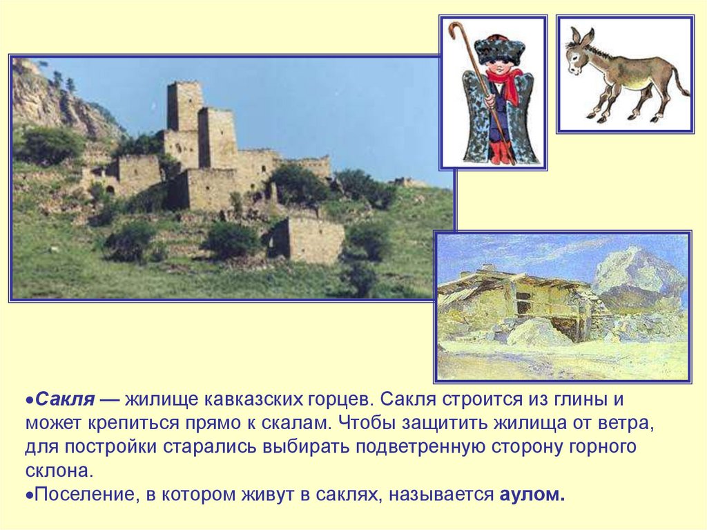Сакля — жилище кавказских горцев. Сакля строится из глины иможет крепиться прямо к скалам. Чтобы защитить жилища от ветра,