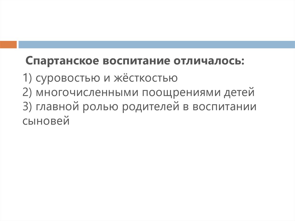 Спартанское воспитание отличалось:1) суровостью и жёсткостью
