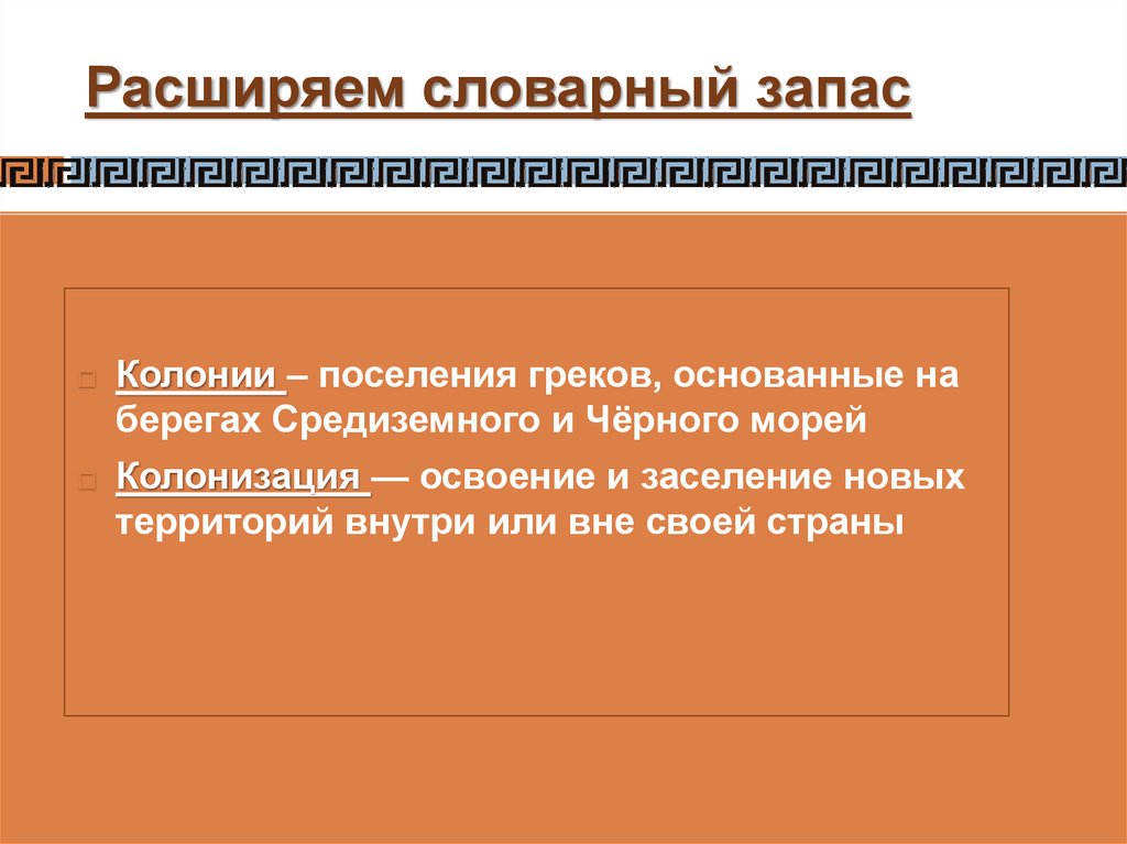 Расширяем словарный запасКолонии – поселения греков, основанные на