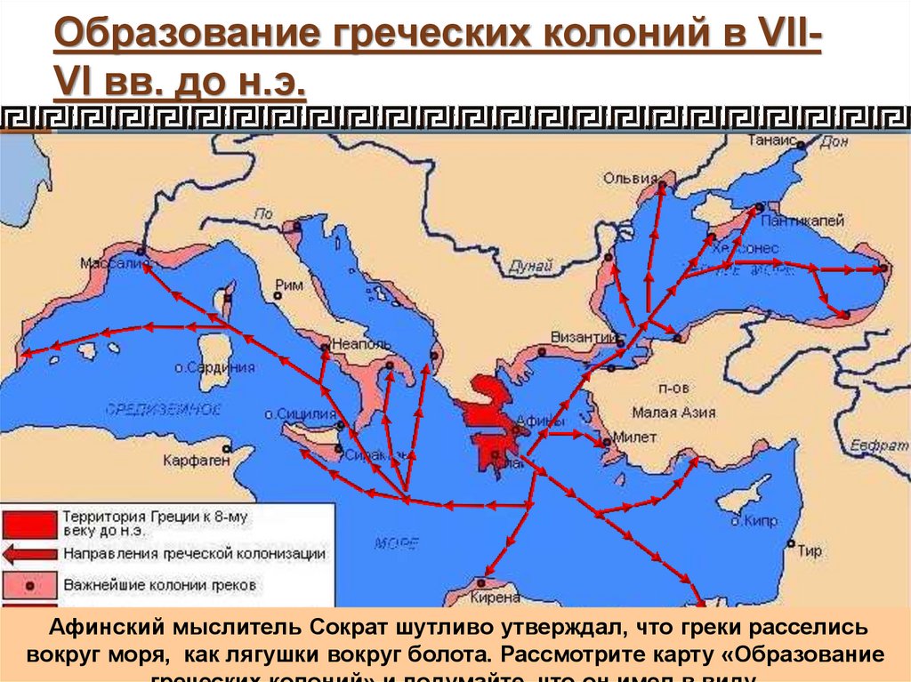 Образование греческих колоний в VIIVI вв. до н.э.Афинский мыслитель Сократ шутливо утверждал, что греки расселись