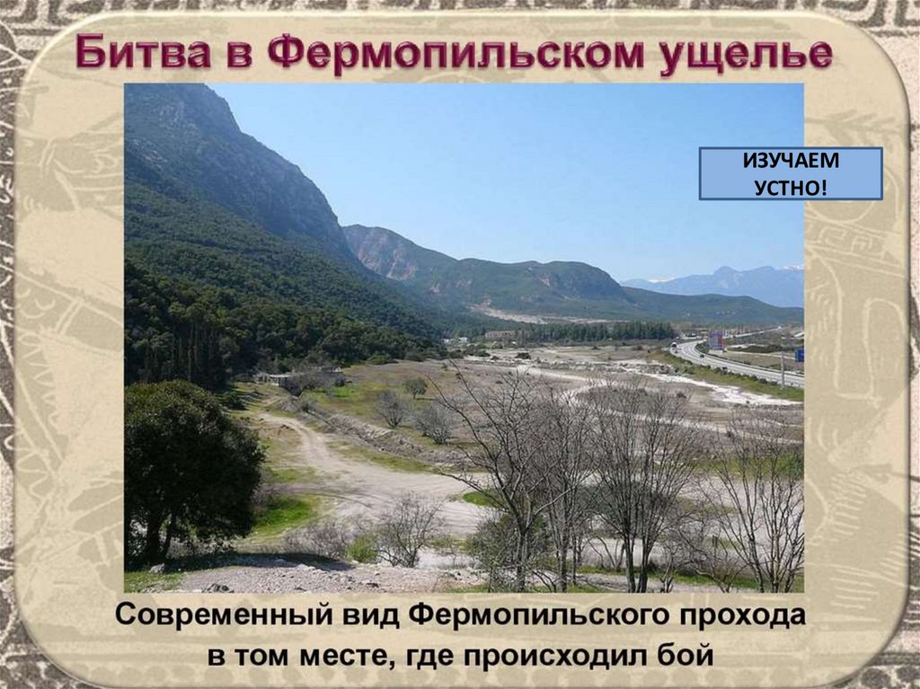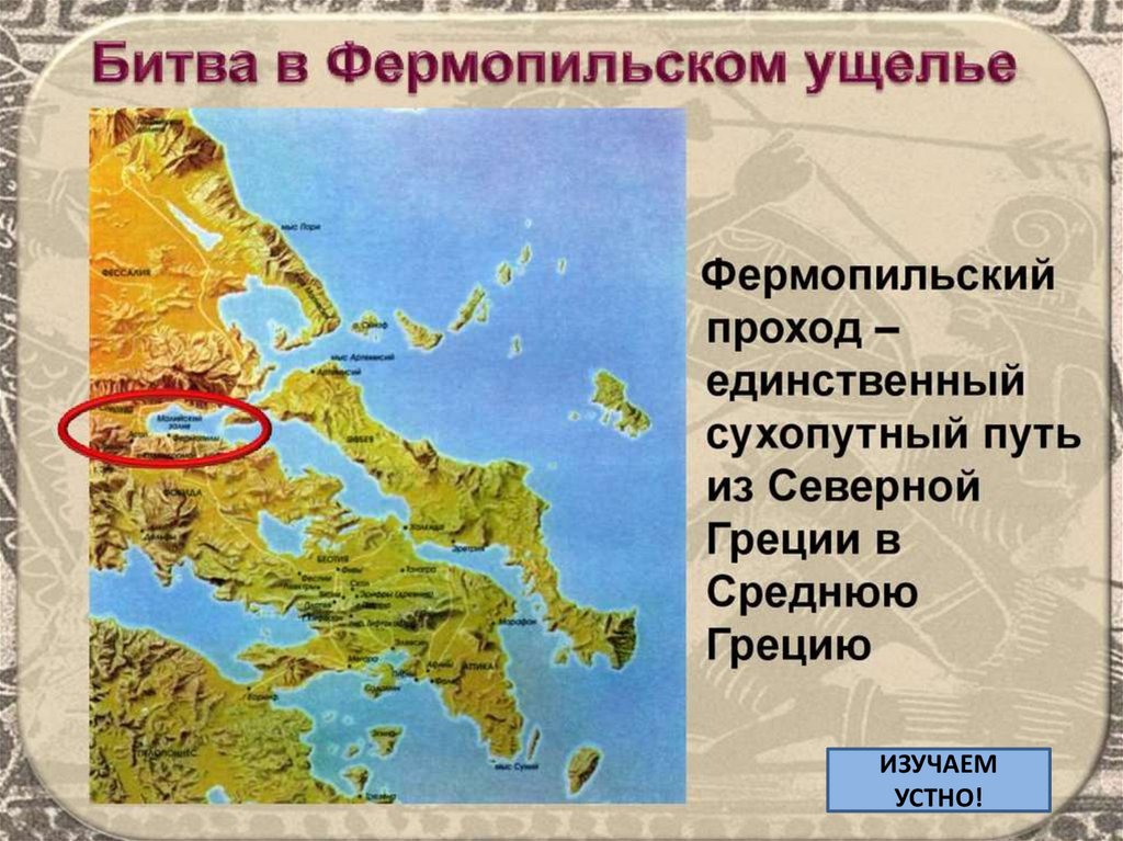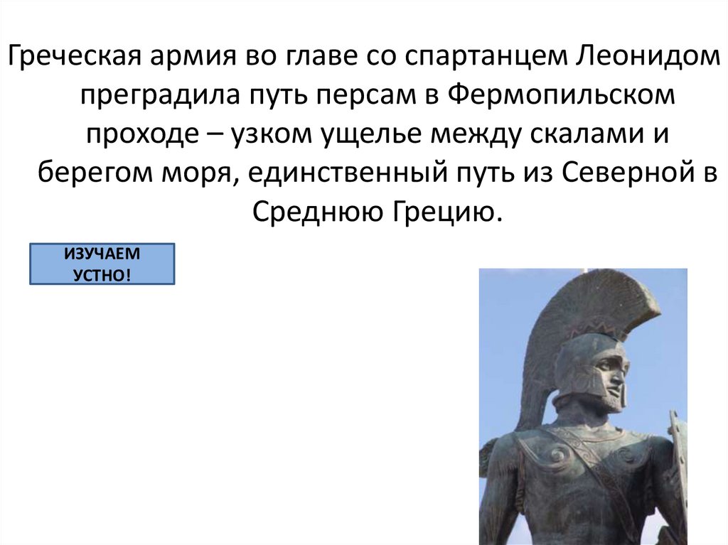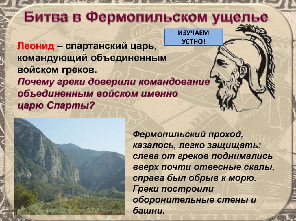 Греческая армия во главе со спартанцем Леонидомпреградила путь персам в Фермопильском