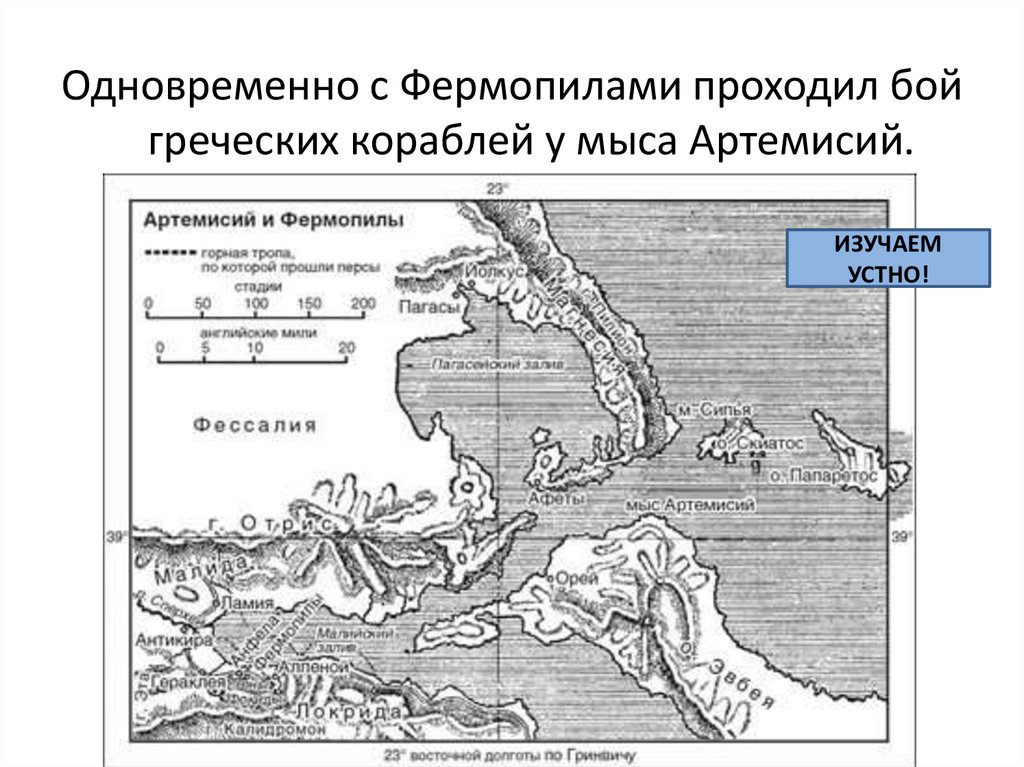 Одновременно с Фермопилами проходил бойгреческих кораблей у мыса Артемисий.