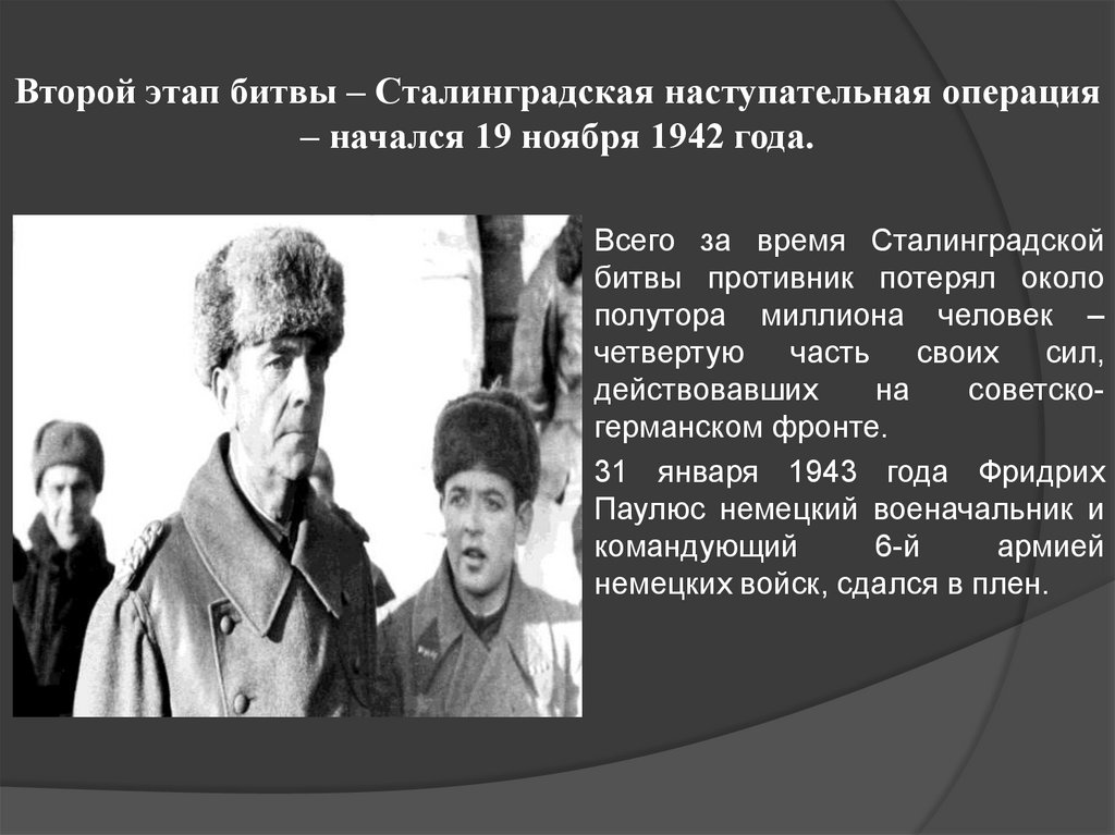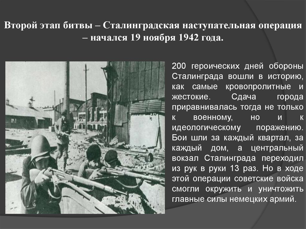 Второй этап битвы – Сталинградская наступательная операция– начался 19 ноября 1942 года.