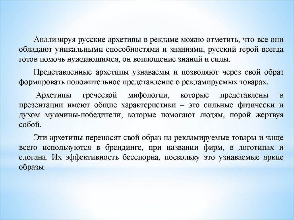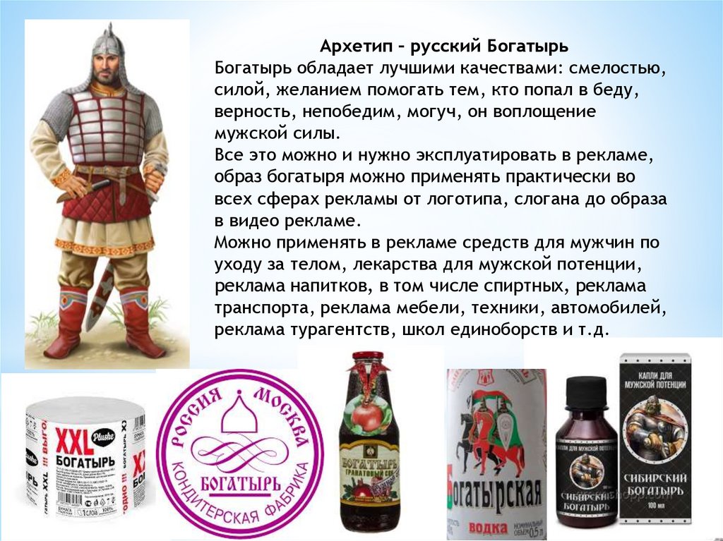Анализируя русские архетипы в рекламе можно отметить, что все ониобладают уникальными способностями и знаниями, русский герой всегда