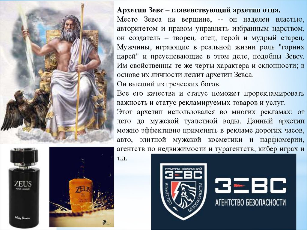 Архетип Зевс – главенствующий архетип отца.Место Зевса на вершине, -- он наделен властью,