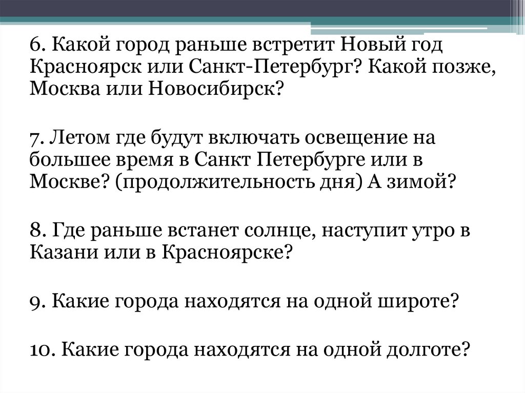 6. Какой город раньше встретит Новый годКрасноярск или Санкт-Петербург? Какой позже,