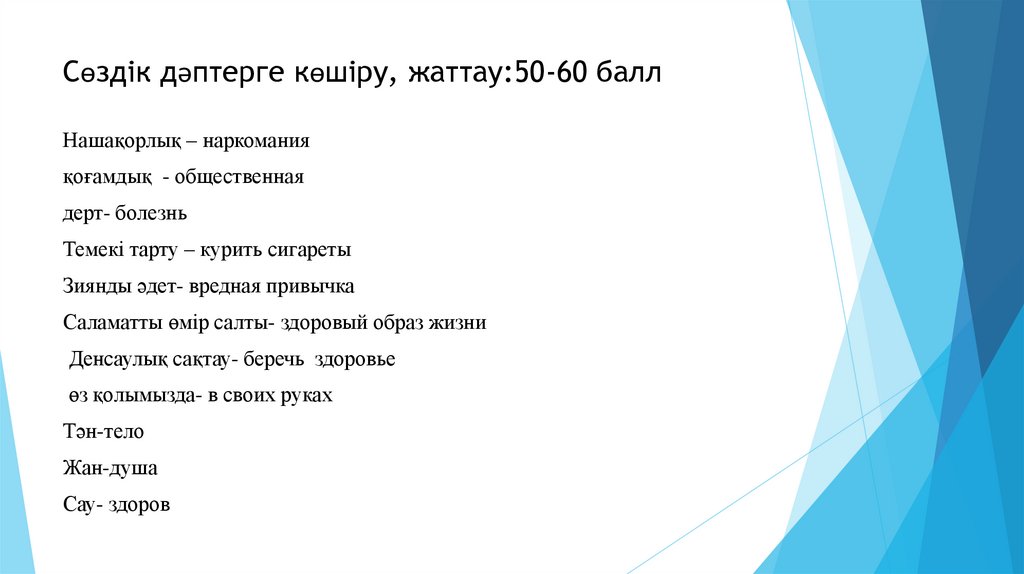 Сөздік дәптерге көшіру, жаттау:50-60 баллНашақорлық – наркомания