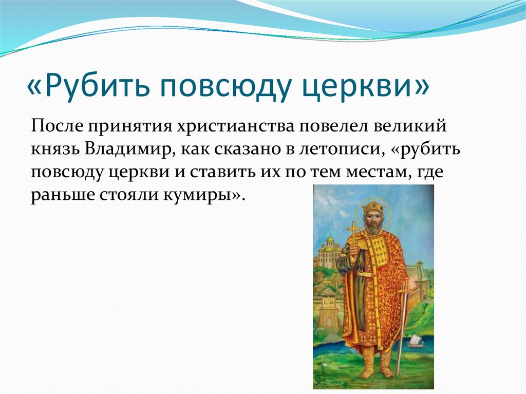 «Рубить повсюду церкви»После принятия христианства повелел великий