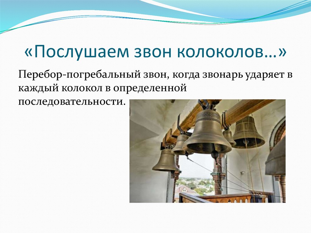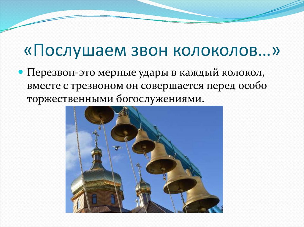 «Послушаем звон колоколов…»Перезвон-это мерные удары в каждый колокол,