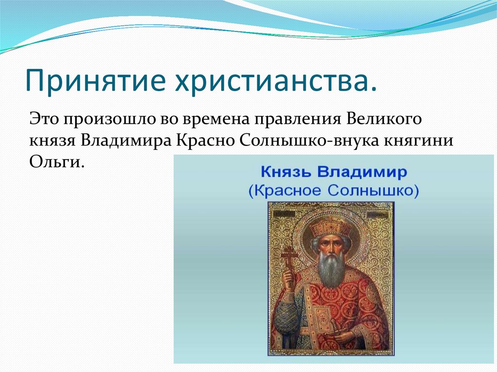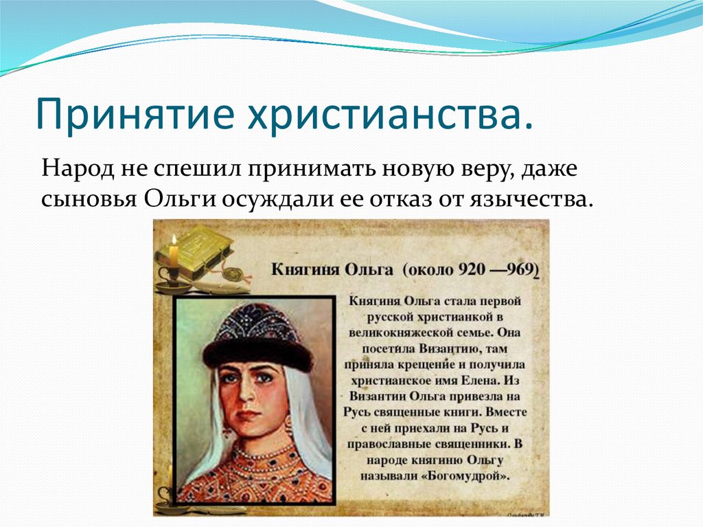Принятие христианства.Одно из первых приняла христианство княгиня
