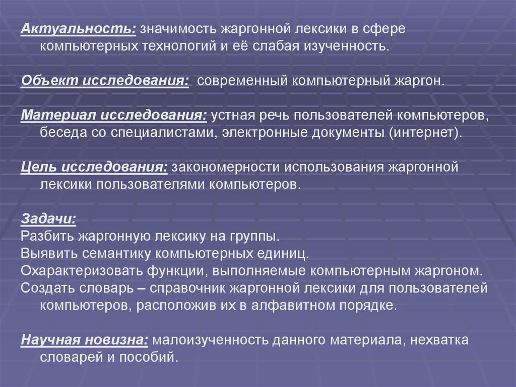 Актуальность: значимость жаргонной лексики в сферекомпьютерных технологий и её слабая изученность.