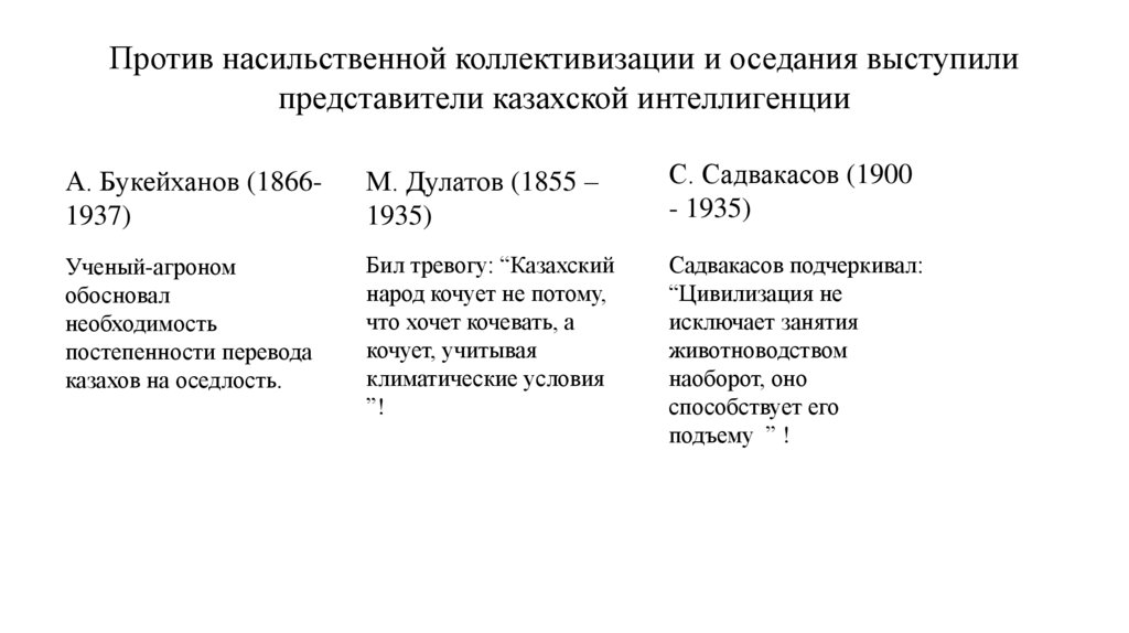 Против насильственной коллективизации и оседания выступилипредставители казахской интеллигенции
