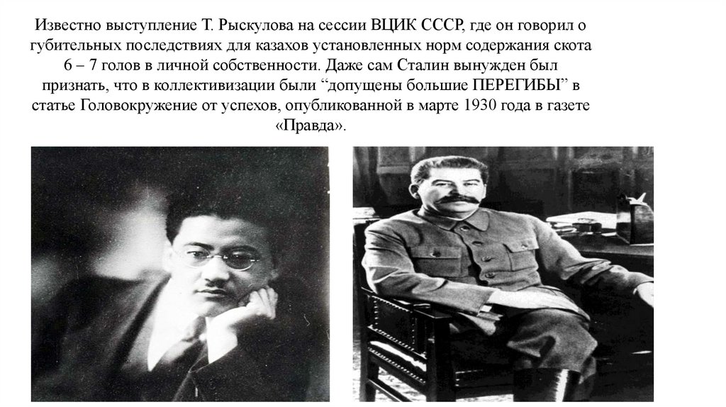 Известно выступление Т. Рыскулова на сессии ВЦИК СССР, где он говорил огубительных последствиях для казахов установленных норм содержания скота