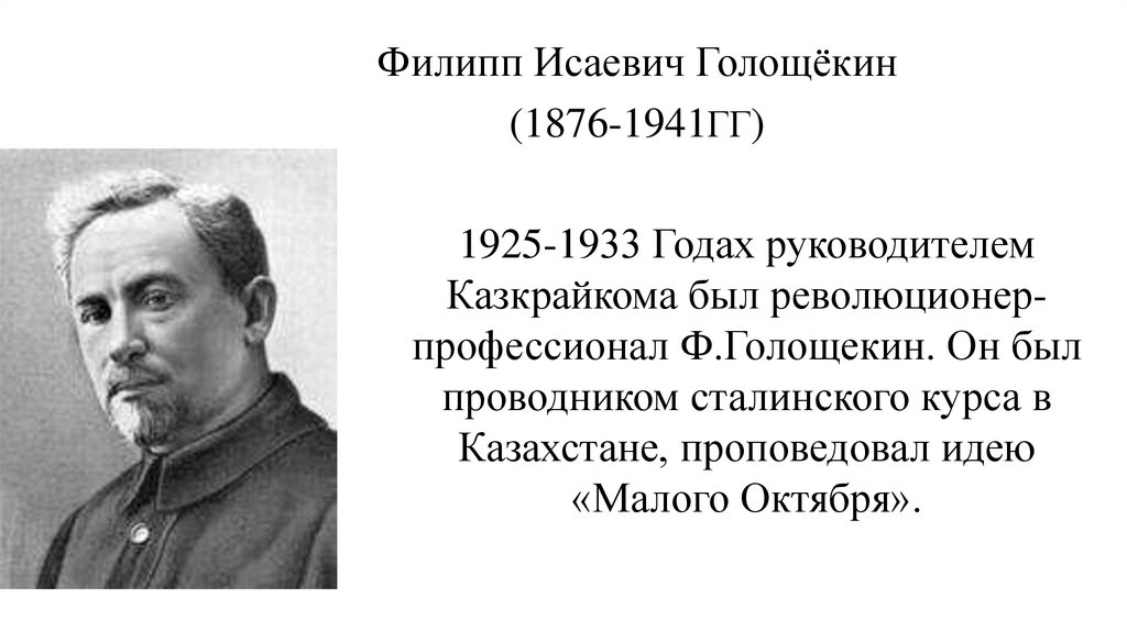 Казкрайкома был революционерпрофессионал Ф.Голощекин. Он был