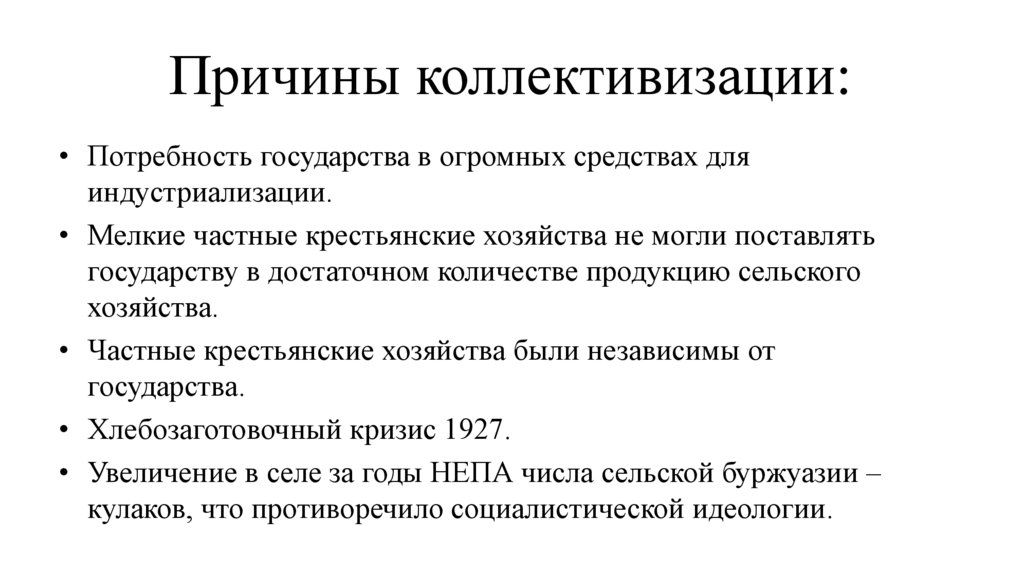 Причины коллективизации:• Потребность государства в огромных средствах для