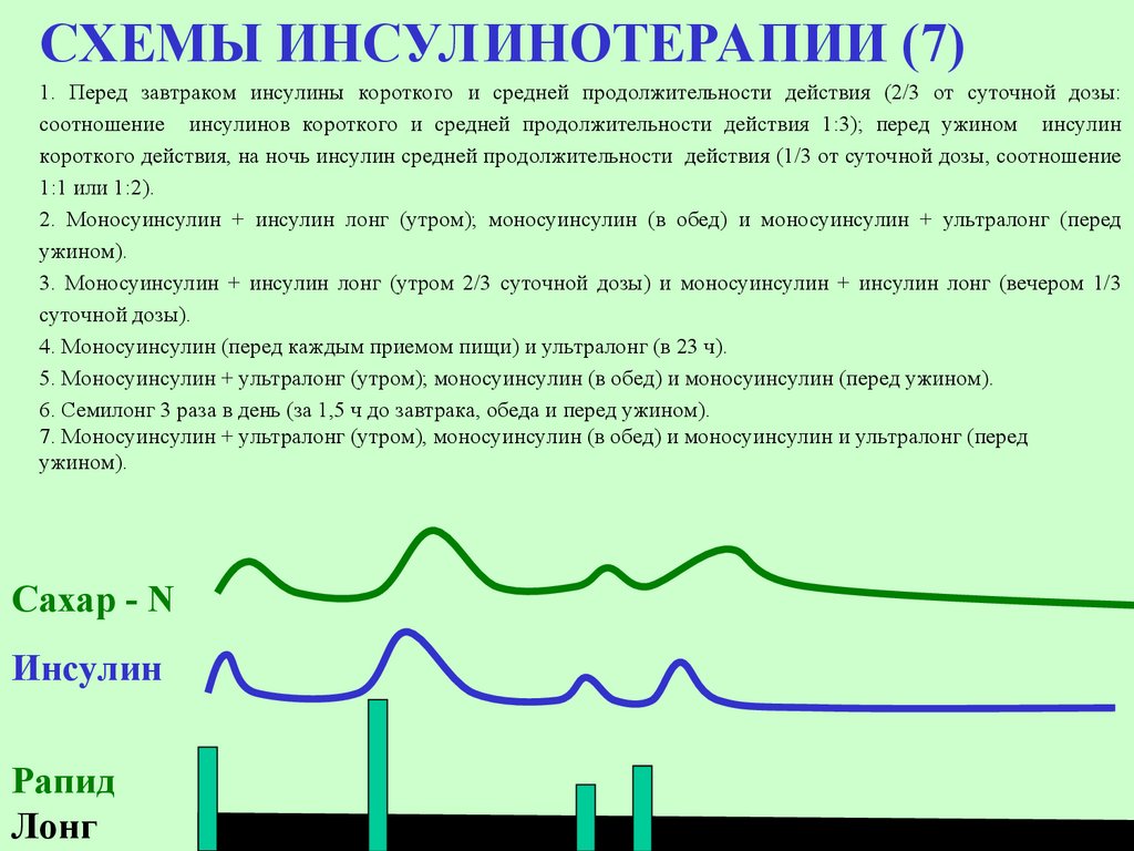 7. Моносуинсулин + ультралонг (утром), моносуинсулин (в обед) и моносуинсулин и ультралонг (перед