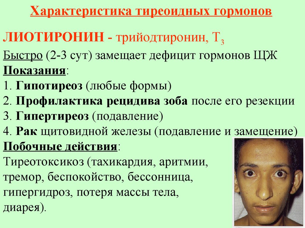 Быстро (2-3 сут) замещает дефицит гормонов ЩЖ