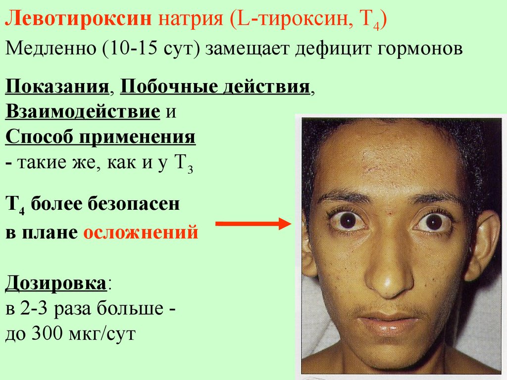 Левотироксин натрия (L-тироксин, Т4)Медленно (10-15 сут) замещает дефицит гормонов