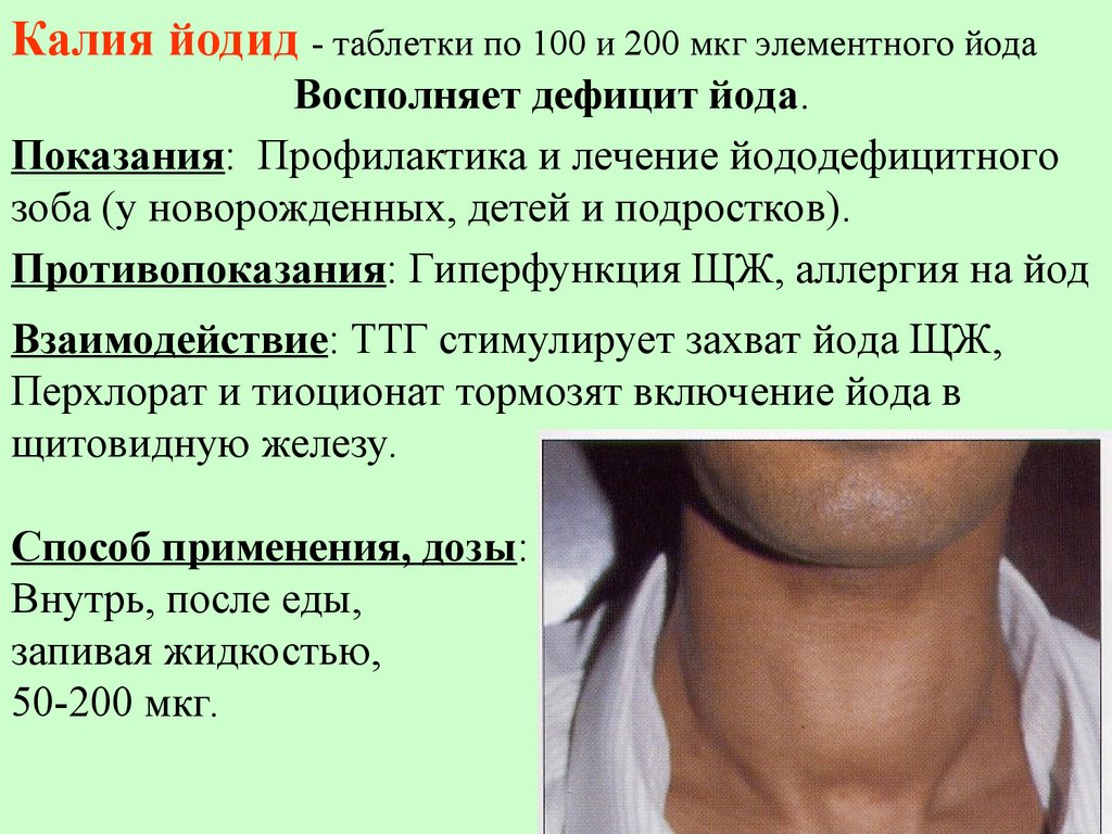 Калия йодид - таблетки по 100 и 200 мкг элементного йодаВосполняет дефицит йода.