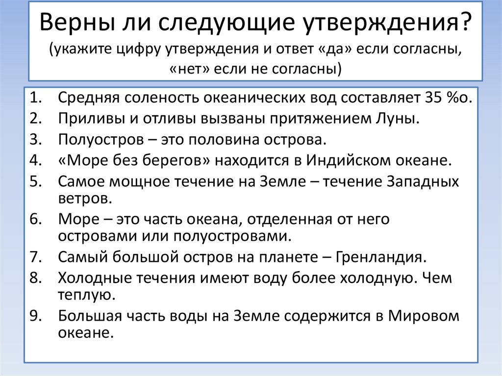 Верны ли следующие утверждения?(укажите цифру утверждения и ответ «да» если согласны,