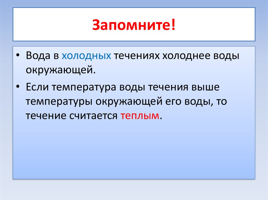Запомните!• Вода в холодных течениях холоднее воды