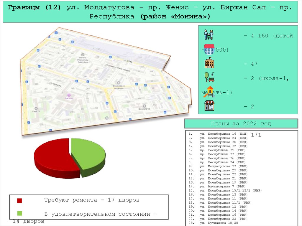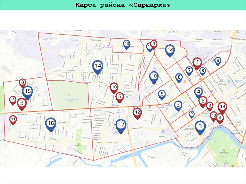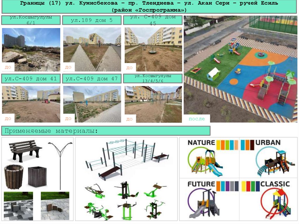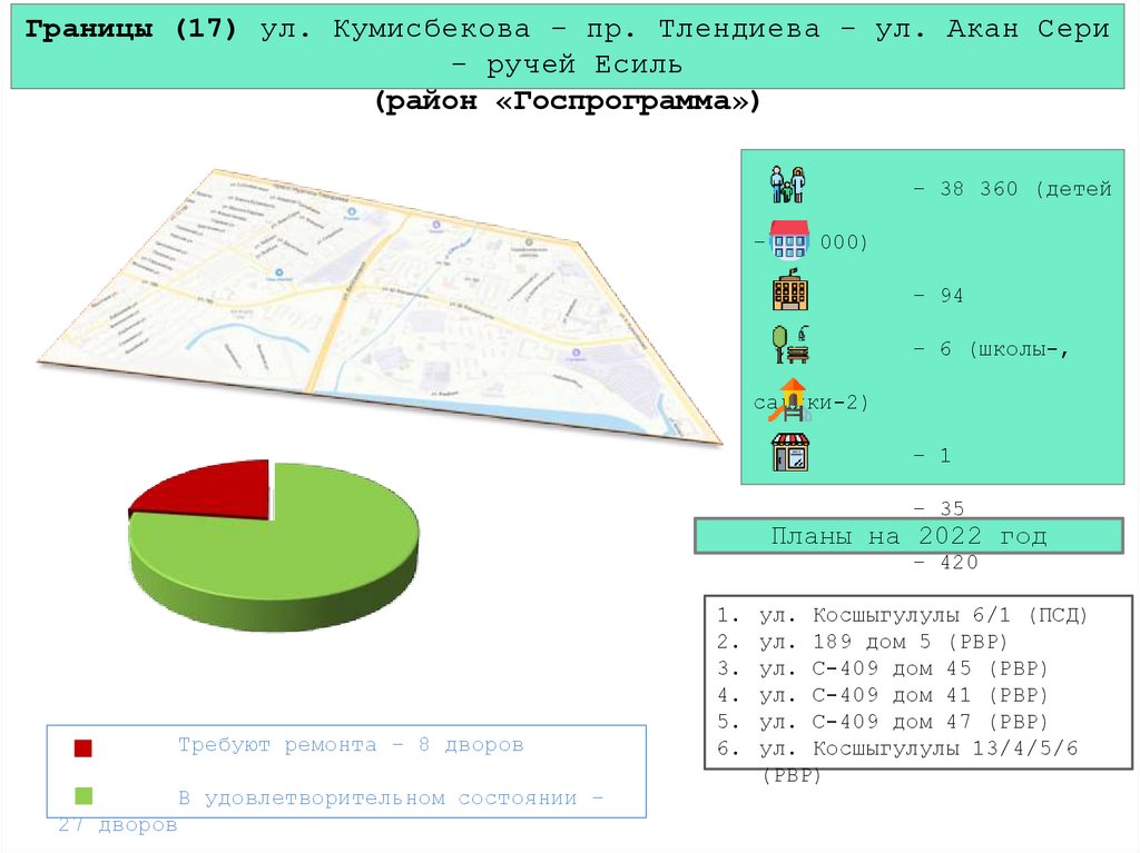 Границы (17) ул. Кумисбекова – пр. Тлендиева – ул. Акан Сери – ручей Есиль(район «Госпрограмма»)