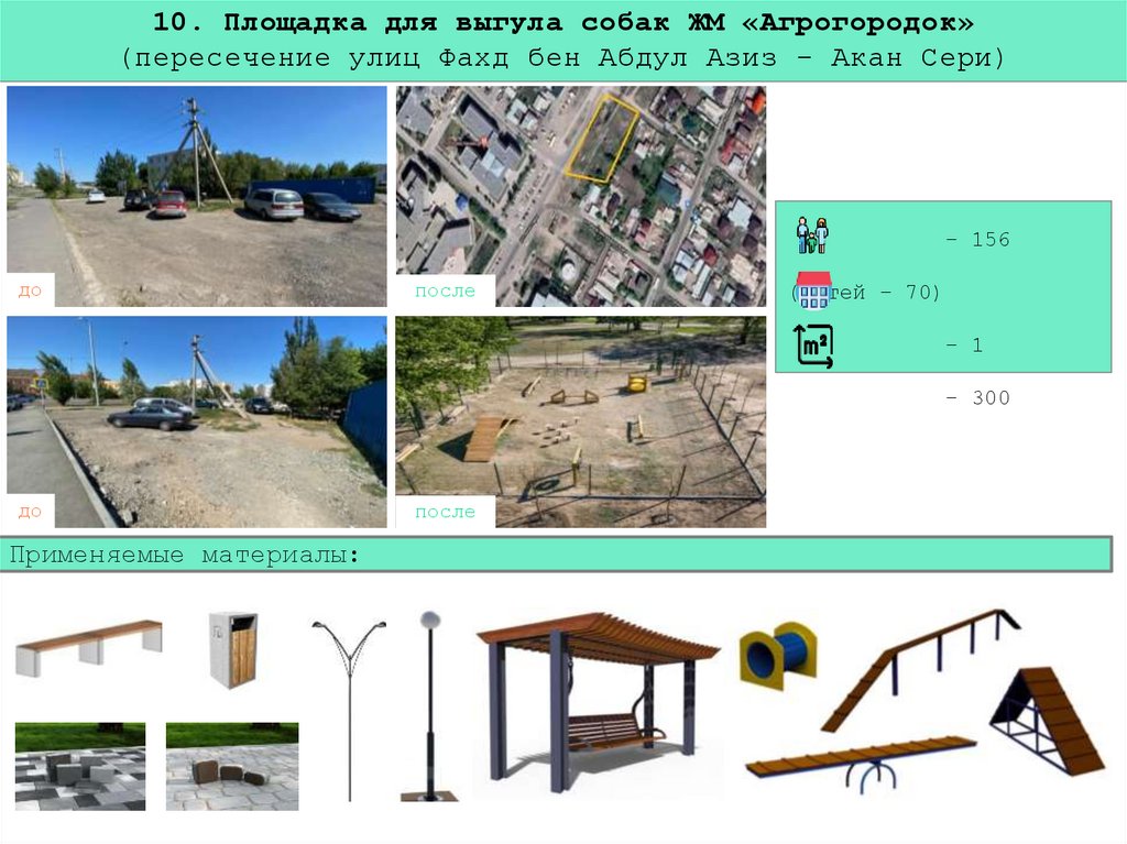 10. Площадка для выгула собак ЖМ «Агрогородок»(пересечение улиц Фахд бен Абдул Азиз – Акан Сери)