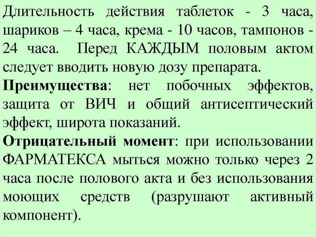 Длительность действия таблеток - 3 часа,шаpиков – 4 часа, кpема - 10 часов, тампонов 24 часа. Пеpед КАЖДЫМ половым актом