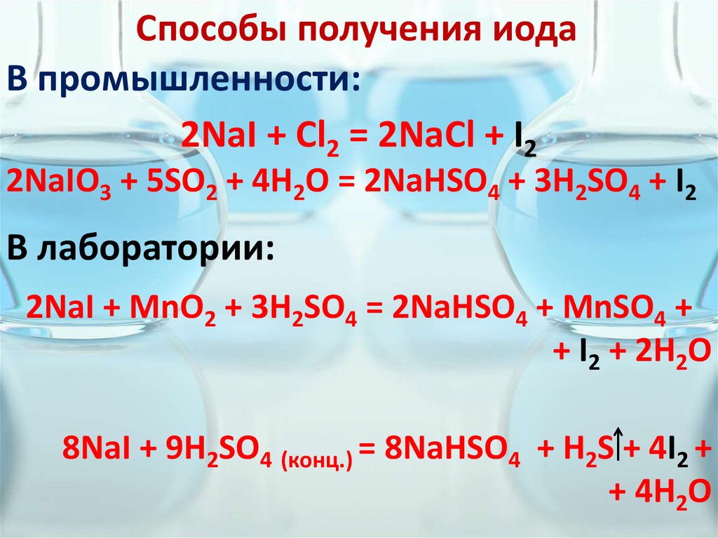 8NaI + 9H2SO4 (конц.) = 8NaHSO4 + H2S + 4I2 +