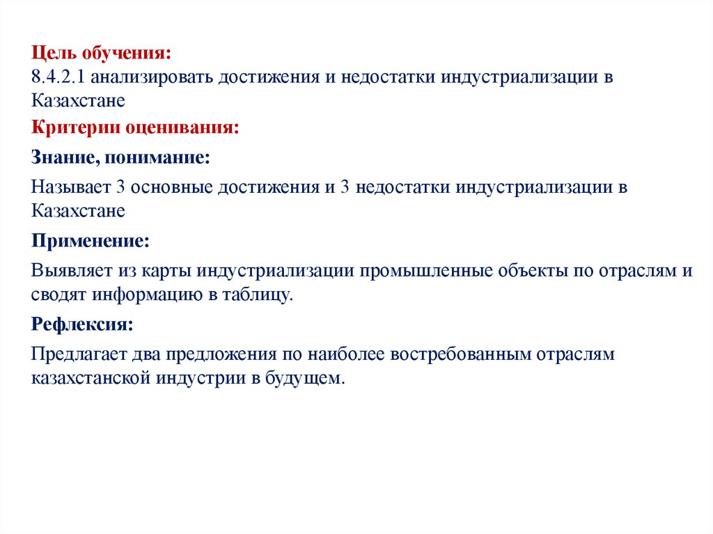 Цель обучения:8.4.2.1 анализировать достижения и недостатки индустриализации в