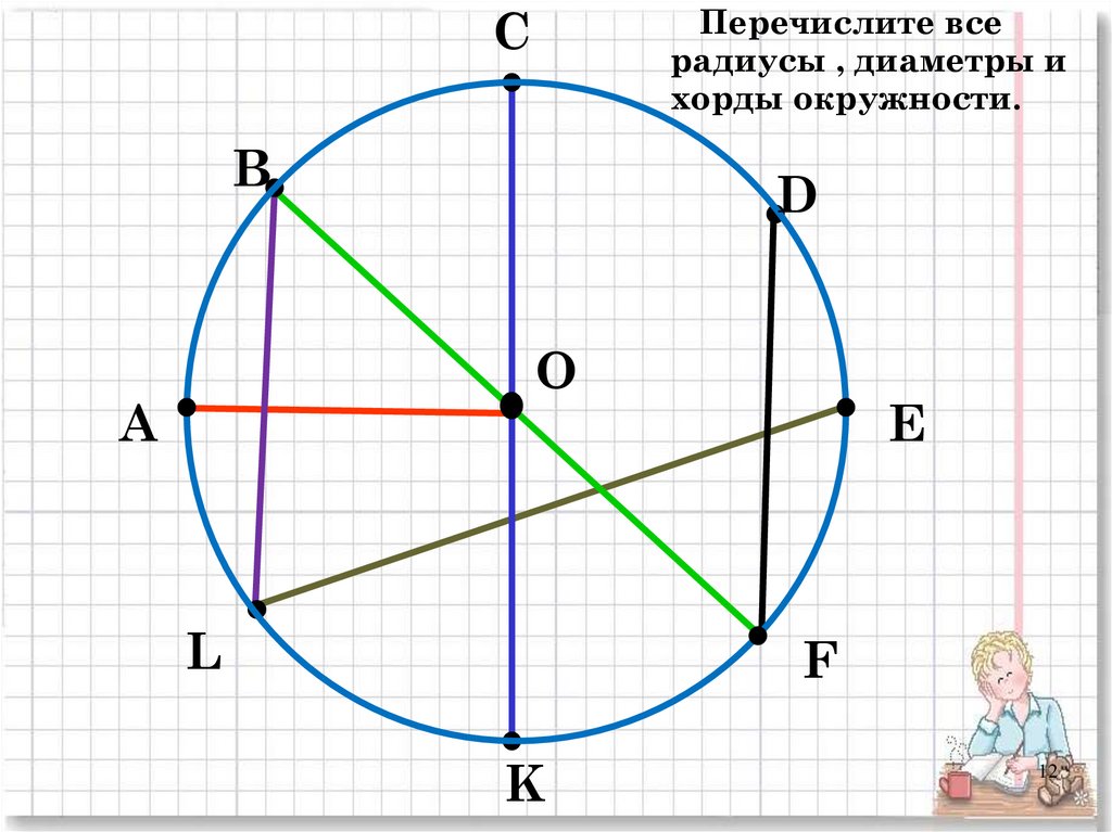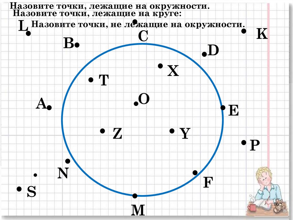 Назовите точки, лежащие на окружности.Назовите точки, лежащие на круге: