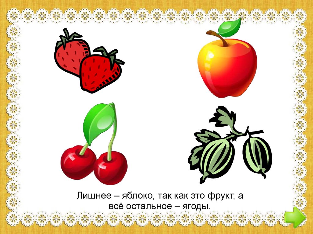 Лишнее – яблоко, так как это фрукт, авсё остальное – ягоды.