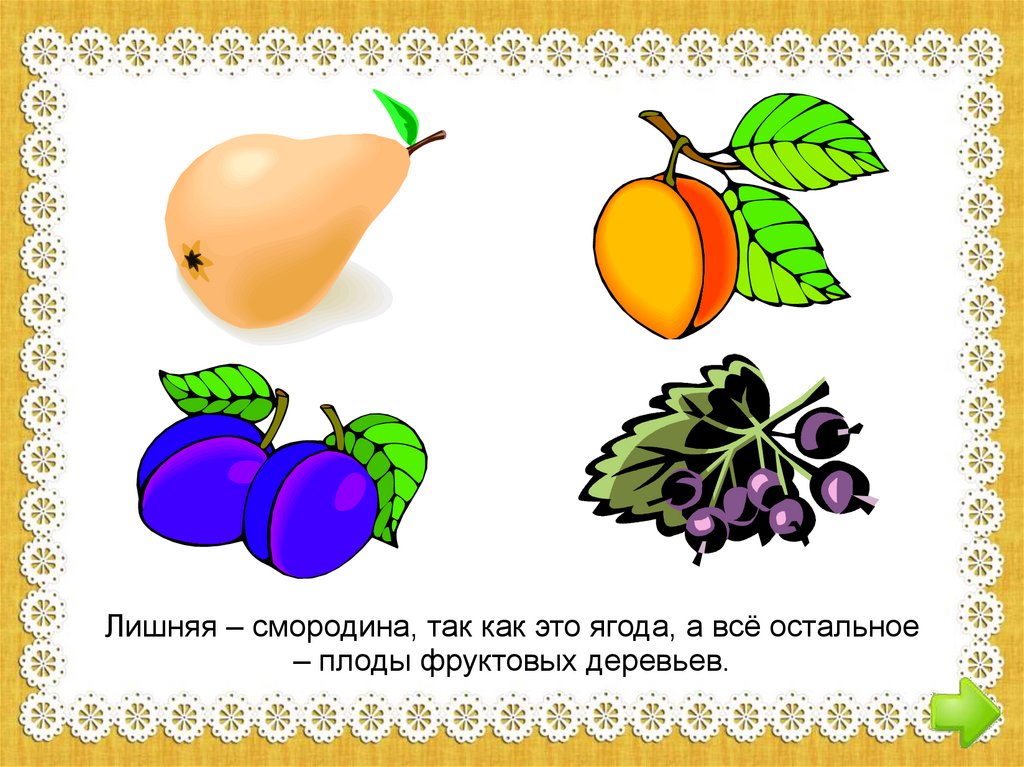 Лишняя – смородина, так как это ягода, а всё остальное– плоды фруктовых деревьев.